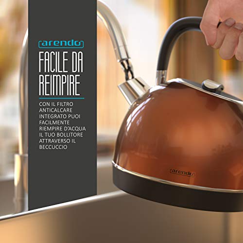 Arendo - Bollitore elettrico vintage in acciaio inox - L'Originale Arendo - 2200 watt - 1,7 litri - Spegnimento automatico - Indicatore laterale di livello acqua - Riempibile dal beccuccio - Rame