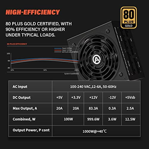 ARESGAME Alimentatore ATX 1000W, 80 Plus Gold, Completamente Modulare, Nero
