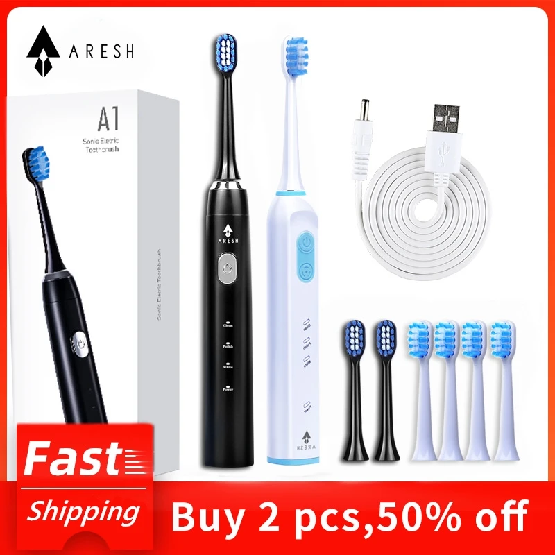 ARESH A1A2 Electric Toothbrush Rechargeable Buy One Get One Free Sonic Toothbrush 3 Mode IPX7 Waterproof With 6 Brush Head Gift