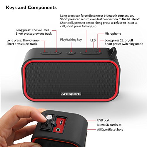 Arespak Wireless Bluetooth 4.0 Altoparlante Impermeabile, All'aperto Portatile Stereo Speaker 1200mAh Batteria 10 Ore Nero + Rosso