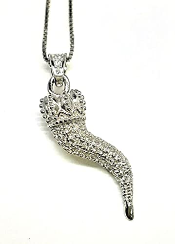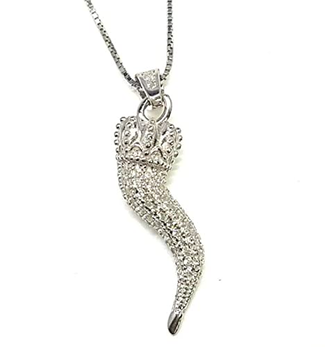 Argento 925 COLLANA UNISEX PORTAFORTUNA CON CORNO ZIRCONI BIANCHI