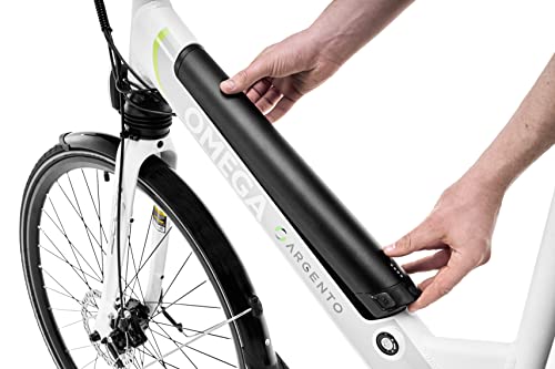 Argento E-Bike Omega, Motore 250W, Freni a Disco, Batteria 374Wh, Fino a 70km, Schermo LCD, Cambio Shimano 7 Rapporti, Bianco