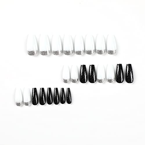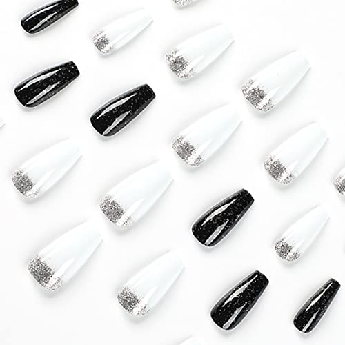 Argento Glitter Premere sulle unghie,24 Pezzi bianco e nero unghie false lucido di media lunghezza unghie finte piena copertura Coffin Nails Tips per le donne ragazze decorazione del partito