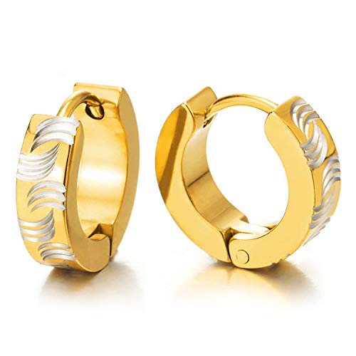 2 Argento Oro Orecchini a Cerchio con Onda Modello laser, Orecchini da Uomo, Acciaio Inossidabile, Donna