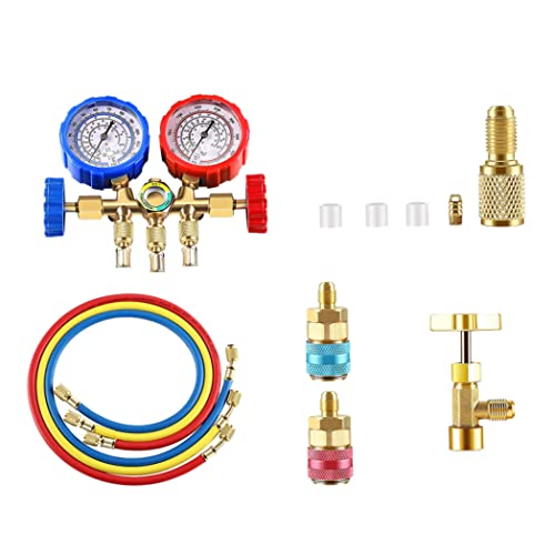 L'indicatore diagnostico del refrigerante del refrigerante dell'aria comprende 3 tubi di ricarica Freon a cinque piedi in 3 colori per un facile riconoscimento, che sono rossi per alta pressione, blu per bassa pressione e giallo per la bottiglia del refrigerante
