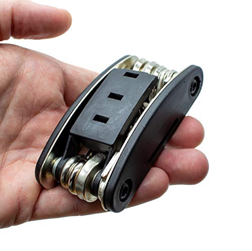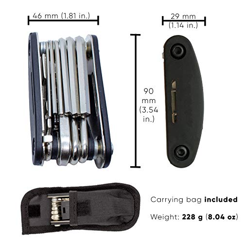 Multifunzione: strumento con 6 punte esagonali (2-6 mm), cacciavite a croce/intaglio, dado (8, 9, 10 mm), chiave inglese (8, 10, 15 mm). Per avvitare e raggi, regolare il manubrio, ecc.