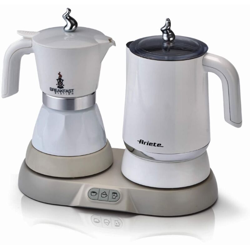 Con Breakfast Station é possibile creare tante colazioni diverse a base di caffè, latte, tè ed altri infusi, in poche mosse ed in pochissimi minuti. 3 prodotti in 1: moka + cappuccinatore che è al contempo bollitore, azionabili contemporaneamente e ben 5 funzioni - moka, montalatte a caldo e a freddo e riscaldamento dell'acqua ad 80° e 100°C. Basta accendere la fantasia e l'inizio giornata avrà tutto un altro sapore! Larghezza 320 mm Profondità 150 mm Altezza 240 mm Peso 2,3 kg Potenza 500 W Spegnimento automatico dopo (max) 30 min Larghezza imballo 305 mm Profondità imballo 215 mm Altezza imballo 250 mm Peso dell'imballo 2,8 kg Colore del prodotto Bianco Tipo di controllo Pulsanti Display incorporato No Tanica acqua rimovibile Sì Capacità 0,25 L Posizionamento dell'apparecchio Superficie piana Tipo di prodotto Boccale per moca elettrico Capacità tanica acqua 0,25 L Capacità in tazze 4 tazze Macinatore integrato No Sistema di acqua calda No Larghezza scatola principale 32,5 cm
