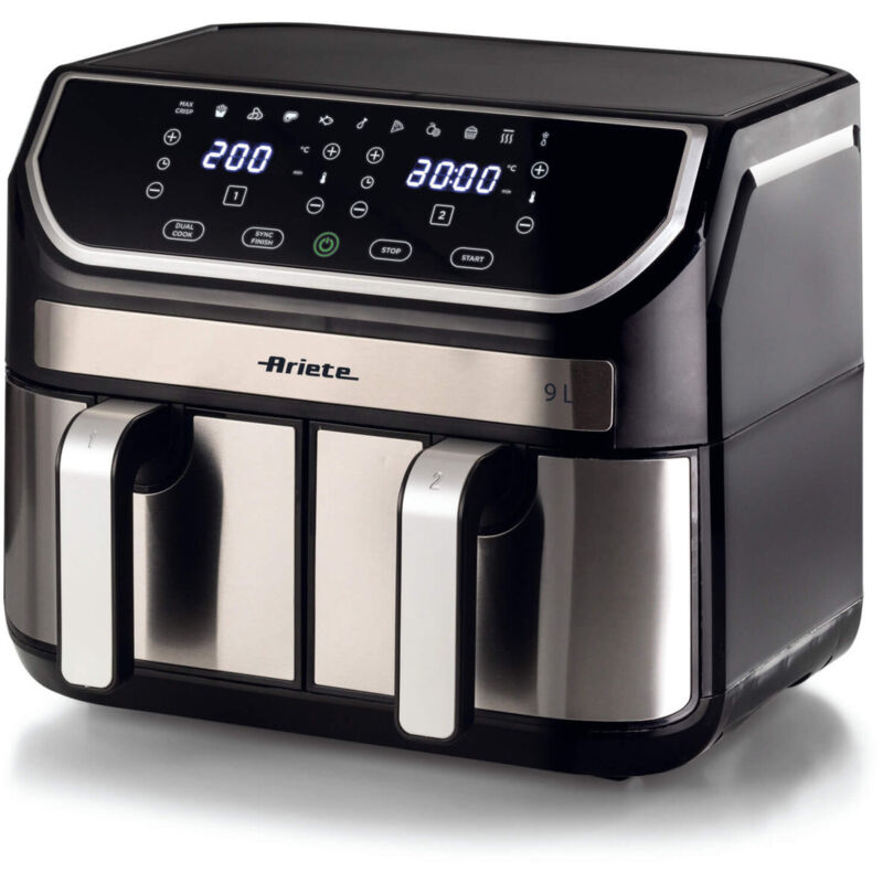 Fritto con un solo cucchiaio di olio La frittura piace veramente a tutti, grandi e bambini, ma non sempre rappresenta un'opzione salutare per tutta la famiglia. Friggere con l'olio infatti aumenta la quantità di grassi saturi presenti nei cibi, rendendoli molto calorici e difficilmente digeribili. La frittura ad aria evita l'utilizzo di olio (ne basterà un solo cucchiaio!) ma senza rinunciare alla croccantezza tipica della frittura Friggi senza odori in casa Frittura sì, cattivi odori no! Con la friggitrice ad aria Friggitrice ad aria 9L friggi qualsiasi alimento, senza fumo e senza lasciare un fastidioso odore di fritto in casa tipico delle friggitrici ad olio. L'aria ad alta temperatura infatti circola all'interno della friggitrice ad aria, cuocendo velocemente e senza grassi, senza far uscire all'esterno fumo e odori Multifunzione Friggi come piace a te e alla tua famiglia. Con la funzione Max Crisp e i 11 programmi preimpostati puoi impostare timer, cottura e temperatura. 3,6 kg