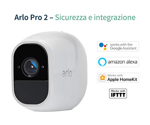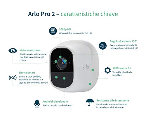 Arlo Pro2 VMS4130P Kit Base Sistema di Videosorveglianza Wi-Fi con 1 Telecamera di Sicurezza, Audio 2 Vie, Batteria, Full HD, Visione Notturna, Interno/Esterno, VCR Opz, Alexa e Google Wi-Fi