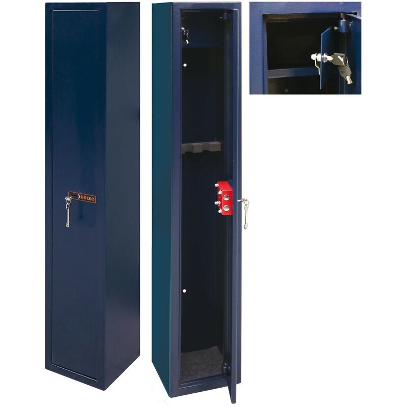 Armadio portafucili a 3 posti con tesoretto Brixo Serratura doppia mappa Struttura in lamiera d'acciaio mm 2,5 2 catenacci Ø 22 predisposizione per ancoraggio a parete ed a pavimento appoggio calcio antiscivolo in gomma rastrelliera in polietilene Dimensioni L24 x P24 x H143 cm Peso Kg. 21,5