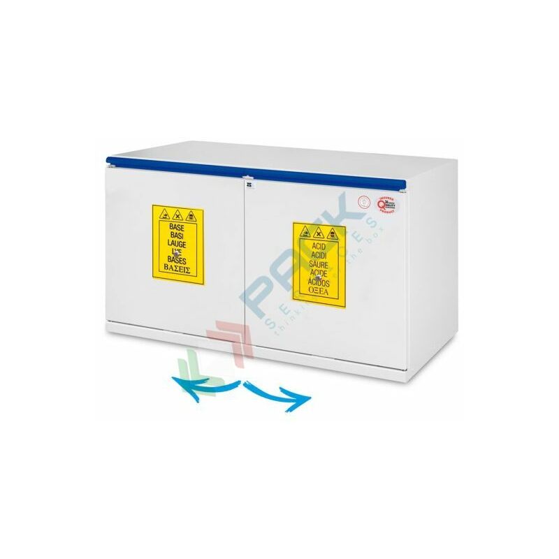 ARMADIO DI SICUREZZA PER LO STOCCAGGIO COMBINATO DI PRODOTTI CHIMICI ACIDI E BASICI Armadio di sicurezza per stoccaggio combinato di prodotti chimici basici e acidi, Mis. esterne 1090 L x 520 P x 720 H mm, Mis. interne 490 + 490 L x 430 P x 630 H mm, capacità 24 + 24 bottiglie da 1 Lt, peso 114 Kg. Serratura con chiave e blocco delle porte, morsetto di terra per prevenire cariche elettrostatiche. Armadio per prodotti chimici realizzato in lamiera di acciaio con vernice antiacido. Le finiture interne sono realizzate in laminato melaminico con alta resistenza ai vapori aggressivi. Pannelli agglomerato idrofugo. Spessore della lamiera 1;