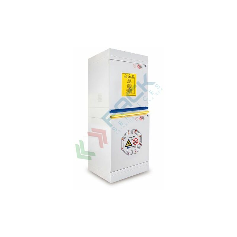 ARMADIO DI SICUREZZA COMBINATO PER LO STOCCAGGIO DI PRODOTTI INFIAMMABILI E CHIMICI, TYPE 90 Armadio di sicurezza combinato per lo stoccaggio di prodotti infiammabili, chimici acidi e basici, con classe di resistenza al fuoco certificata 90 minuti (TYPE 90). Armadio di stoccaggio con Mis. esterne 595 L x 600 P x 1685 H mm, 2 comparti senza aspirazione. Scomparto ACIDI e BASICI a porta: 1 ripiano in acciaio verniciato + 1 ripiano in acciaio Inox, Mis. 530 L x 430 P x 630 H mm e scomparto INFIAMMABILI type 90 a cassettone: vasca e griglia, mis. 483 L x 349 P x 593 H mm. Peso 145 Kg. Armadio di sicurezza realizzato in lamiera di acciaio elettrozincata con spessori di 1;