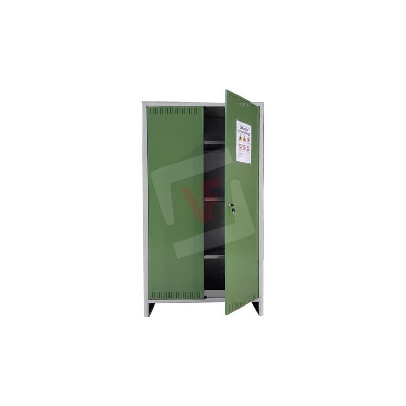 ARMADIO DEPOSITO FITOFARMACI CERTIFICATO LT. 700 CM. 100X40X180H Per lo stoccaggio in sicurezza di anticrittogamici, diserbanti, erbicidi, fitoregolatori, insetticidi e acaricidi. Realizzato in Smontato. Per lo stoccaggio di antiparassitari, anticrittogamici, diserbanti, erbicidi, fitoregolatori, insetticidi e acaricidi. Struttura in lamiera di acciaio pressopiegata a freddo con rivestimento superficiale di finitura, spessore 6/10, ripiani e vaschetta raccolta 7/10. Corredato da 3 ripiani zincati forati, fermi ante, arresto battente, vaschetta raccolta zincata 11 lt., adesivo segnalazione pericolo, dichiarazione conformità. Risponde ai dettami D.P.R. 290/2001, direttiva 2009/128 CE, D.LGS 150/2012, D.M. 22-01-2014. Chiusura a chiave con serratura, struttura grigia, porta verde.