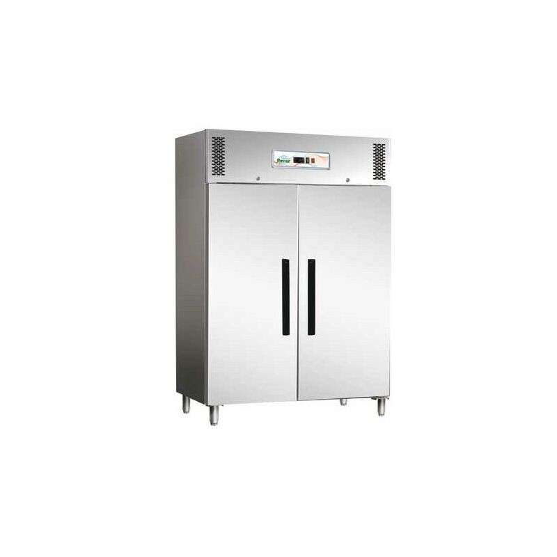 Codice RS7153 - Armadio frigorifero a 2 porte, modello FO-ECV1200BT, dimensioni cm. 134x81x200 (lxpxh), temperatura di esercizio -18/-20 °C, 230 volt, 900 watt, 1173 lt. Dotazione interna n.6 griglie. Armadio refrigerato GN 2/1 in acciaio inox AISI 430. Refrigerazione ventilata, gruppo incorporato in vano superiore. Vano motore con fianchi coibentati. Controllo temperatura elettronico con termostato digitale. Resistenza elettrica intorno alla cornice porta per eliminazione della condensa. Evaporazione automatica dell'acqua di condensa. Porta con molla di ritorno. Chiusura porta con chiave. Guarnizione porta estraibile senza utensili. Fondo con angoli arrotondati. Pannelli esterni di fondo e schienale in lamiera galvanizzata. Piedini in acciao inox regolabili in altezza.