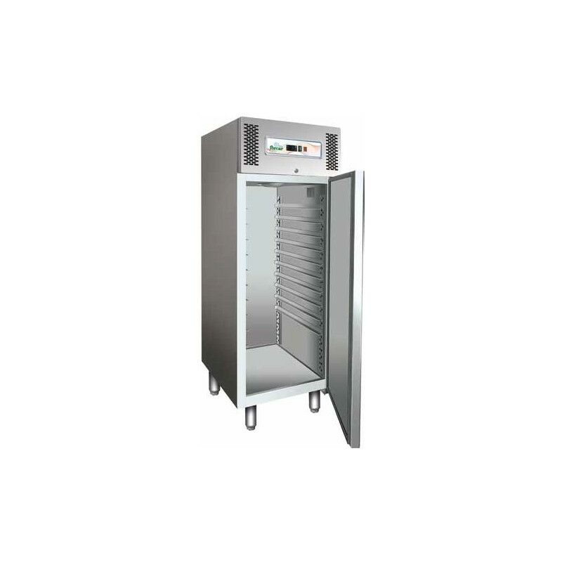 Codice RS0075 - Armadio frigorifero a 1 porta, modello FO-PA800BT, dimensioni cm. 74x99x201 (lxpxh), temperatura di esercizio -10/-22°C, 230 volt, 750 watt, 737 lt. Dotazione interna n.10 coppie guide. Armadio refrigerato per laboratorio pasticceria in acciaio inox AISI 304. Refrigerazione ventilata. Gruppo incorporato. Vano motore con fianchi coibentati. Evaporatore posizionato a scomparsa in modo da avere massimo spazio disponibile. Controllo temperatura elettronico con termostato digitale. Resistenza elettrica intorno alla cornice porta per eliminazione della condensa. Sbrinamento automatico con resistenza elettrica e controllo automatico della temperatura di sbrinamento. Evaporazione automatica dell'acqua di condensa. Evaporatore trattato anticorrosione. Porta con molla di ritorno. Chiusura porta con chiave. Guarnizione porta estraibile senza utensili. Luce interna. Fondo con angoli arrotondati. Pannelli esterni di fondo e schienale in lamiera galvanizzata. Piedini in acciaio inox