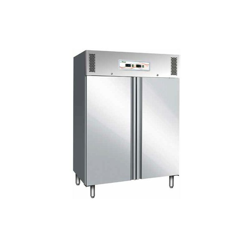 Codice RS2837 - Armadio frigorifero a doppia temperatura (2 vani separati), modello FO-GNV1200DT, dimensioni cm. 134x83x201 (lxpxh), temperatura di esercizio -2/+8°C -18/-22°C, 230 volt, 1100 watt, 507+507 lt. Dotazione interna n.3+3 griglie GN2/1. Armadio refrigerato GN2/1 in acciaio inox AISI 304. Refrigerazione ventilata. Gruppi incorporati. Evaporatori posizionati a scomparsa in modo da avere massimo spazio disponibile. Vano motore con fianchi coibentati. Controllo temperatura elettronico con termostati digitali. Resistenza elettrica intorno alla cornice porta per eliminazione della condensa. Sbrinamento automatico con resistenza elettrica e controllo automatico della temperatura di sbrinamento. Evaporazione automatica dell'acqua di condensa. Evaporatore trattato anticorrosione. Porta con molla di ritorno. Chiusura porta con chiave. Guarnizione porta estraibile senza utensili. Luce interna. Fondo con angoli arrotondati. Pannelli esterni di fondo e schienale in lamiera