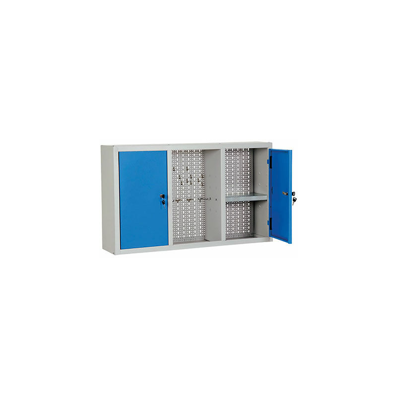 In lamiera di acciaio pressopiegata, con pretrattamento di fosfosgrassaggio e verniciatura a forno continuo. Con schienale forato, 2 pianetti zincati, 2 ante con serratura di colore azzurro. Da assemblare.