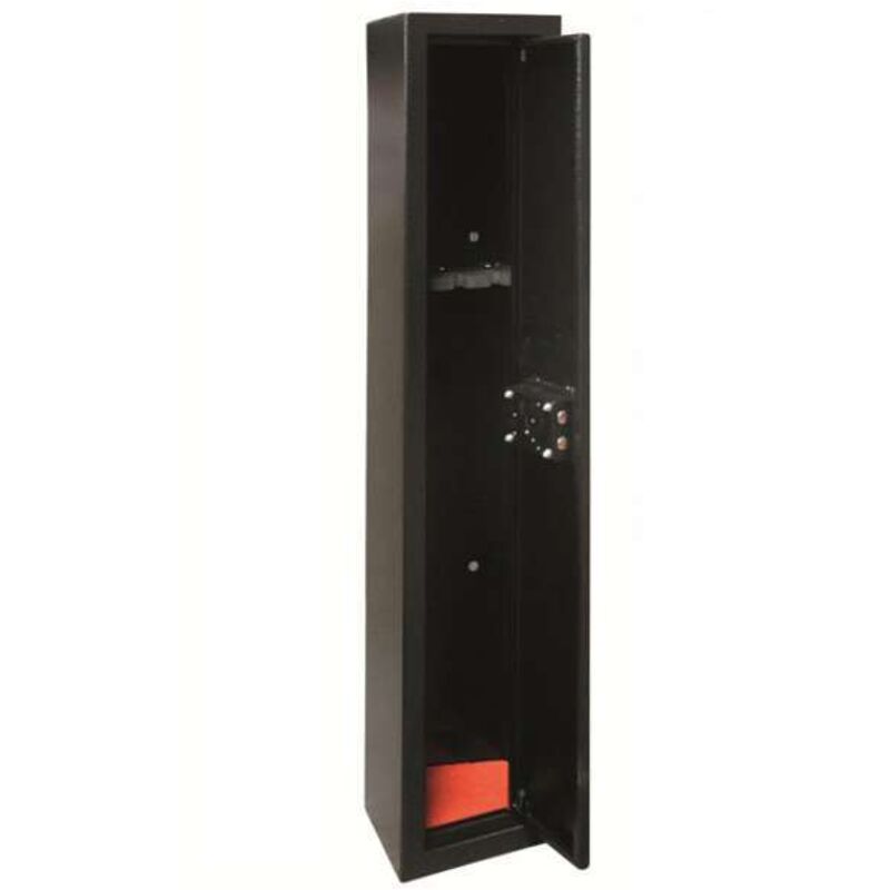 ARMADIO PORTAFUCILI 3 POSTI - mis. esterne: mm.245x205x1250h. peso kg.21,00 Cassa: struttura in lamiera d'acciaio dello spessore di mm.2 con angoli smussati antiabrasione - colore nero con finitura martellata - predisposizione per l'ancoraggio a parete con 4 fori ø mm.15,6 posti sulla parete posteriore dell'armadio con sistemi di fissaggio compresi - Sportello: in acciaio spessore mm.2 con 2 cerniere - chiusura con 2 catenacci orizzontali ø mm.18 - serratura di sicurezza a 2 mandate con 2 chiavi a doppia mappa - apertura porta a filo - rastrelliera in materiale sintetico ad alta densità antigraffio con 3 posti