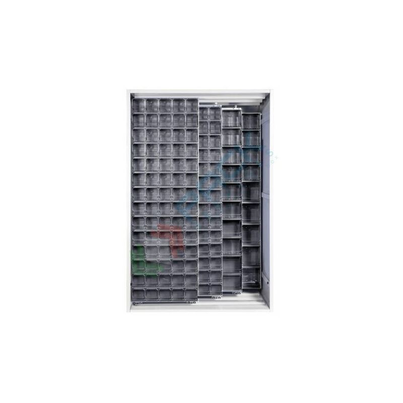 ARMADIO PORTAMINUTERIA CON 224 CASSETTI Armadio porta minuteria realizzato in lamiera elettrosaldata con barre di rinforzo, verniciata a forno in polvere epossidica di colore grigio, Mis. 1270 L x 800 P x 1950 H mm, capacità 224 cassetti. La struttura dell' armadio con cassettiere prevede due pannelli fissi affiancati sul fondo + due pannelli scorrevoli su cuscinetti a sfera;