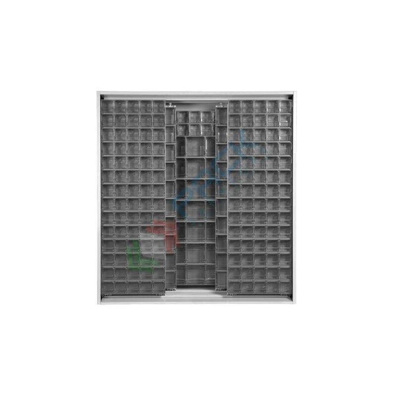 ARMADIO PORTAMINUTERIA CON 201 CASSETTI Armadio porta minuteria realizzato in lamiera elettrosaldata con barre di rinforzo, verniciata a forno in polvere epossidica di colore grigio, Mis. 1870 L x 600 P x 1950 H mm, capacità 201 cassetti. La struttura dell' armadio con cassettiere prevede tre pannelli fissi affiancati sul fondo + quattro pannelli scorrevoli su cuscinetti a sfera.;