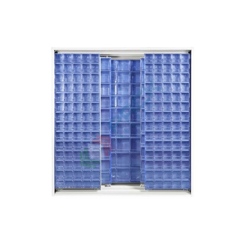 ARMADIO PORTAMINUTERIA CON 281 CASSETTI Armadio porta minuteria realizzato in lamiera elettrosaldata con barre di rinforzo, verniciata a forno in polvere epossidica di colore grigio, Mis. 1870 L x 600 P x 1950 H mm, capacità 281 cassetti. La struttura dell' armadio con cassettiere prevede tre pannelli fissi affiancati sul fondo + quattro pannelli scorrevoli su cuscinetti a sfera.;