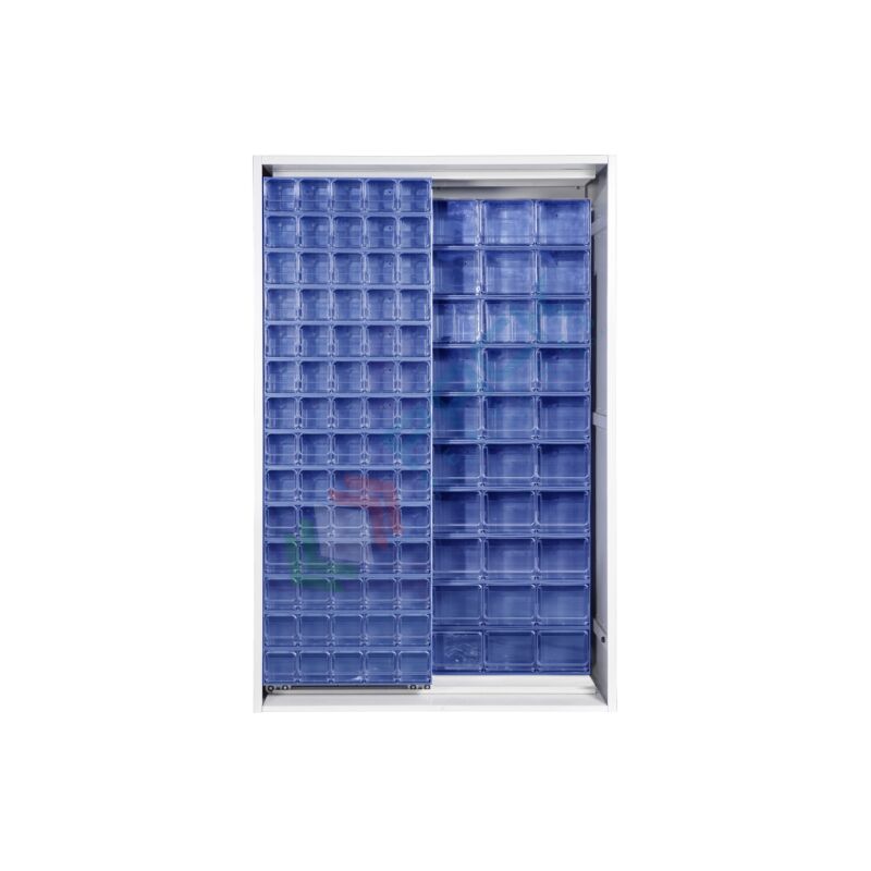 I due pannelli fissi contengono 10+10 cassettiere Cod. Art. CRBOX-3B, il pannello scorrevole contiene 10 cassettiere Cod. Art. CRBOX-3B. Capacità di carico pari circa a 160 Kg per singolo pannello. Colore struttura grigio chiaro RAL 7035, cassettiere colore blu simile RAL 5017. Fornito smontato con manuale di assemblaggio e viteria. Caratteristiche tecniche: Misura: 1270 L x 400 P x 1950 H mm Colore struttura: Grigio chiaro RAL 7035 Colore cassette: Blu RAL 5017 Capacità di carico: 160 Kg per pannello Capacità Lt: 171 Lt Temperatura di esercizio: - 50° + 150° C Larmadio è allestito con un totale di 90 cassetti, così