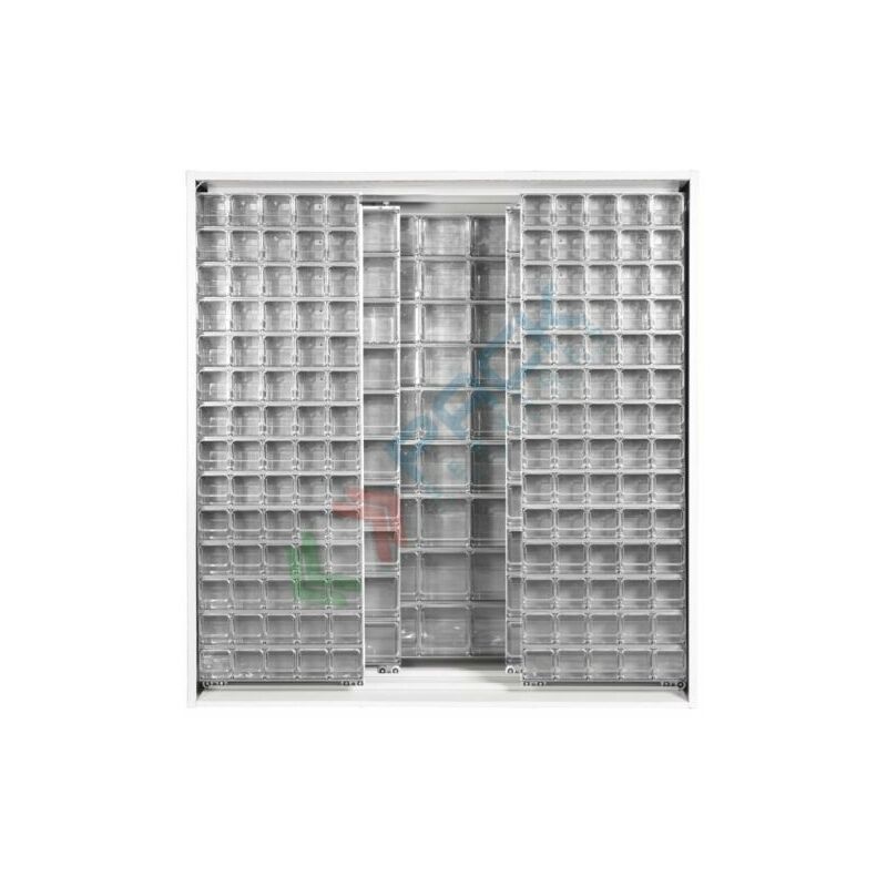 ARMADIO PORTAMINUTERIA CON 281 CASSETTI Armadio porta minuteria realizzato in lamiera elettrosaldata con barre di rinforzo, verniciata a forno in polvere epossidica di colore grigio, Mis. 1870 L x 600 P x 1950 H mm, capacità 281 cassetti. La struttura dell' armadio con cassettiere prevede tre pannelli fissi affiancati sul fondo + quattro pannelli scorrevoli su cuscinetti a sfera.;