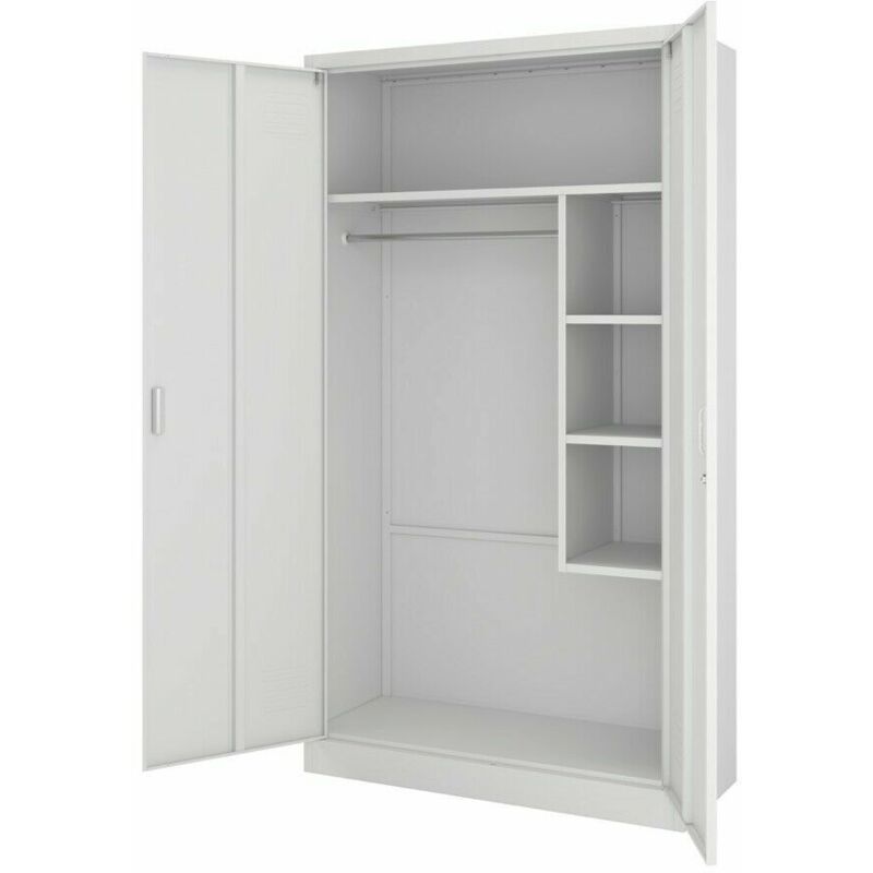1 a ripiano superiore ampio Chiusura a 2 ante battenti dotati di serratura a cilindro Superficie ricoperta con polvere antistatica Armadio organizer utile per riporre anche oggetti lunghi o alti come abbigliamento, scope e aspirapolvere. Può essere utilizzato come armadio per riporre attrezzature sportive come la pesca o prodotti per la pulizia.