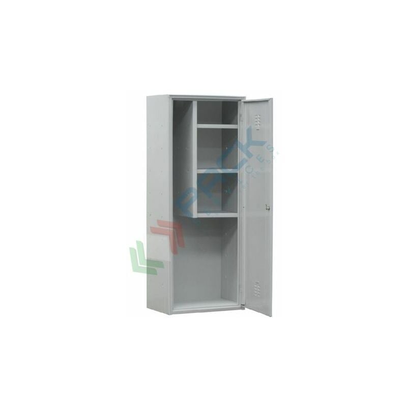 ARMADI PORTASCOPE IN METALLO Armadietti porta scope realizzati in lamiera d'acciaio profilata prima scelta spessore 6/10. Armadi metallici porta scope con ante rinforzate dotate di feritoie di aerazione nella parte superiore ed inferiore e cerniere interne speciali antiscasso. Bordo frontale perimetrale arrotondato anti urto raggio 6 mm e nervature longitudinali su fianchi e porte. Armadi metallici con asole sul tetto per consentire un'ottima circolazione dell'aria. La dotazione interna contenuta in ogni vano comprende: tramezza parziale con 3 piani corti e porta cartellino in materiale plastico applicato all'anta. Armadietti contenitori con corpo e ante nel colore grigio RAL 7035 e sistema di chiusura opzionabile tra maniglia in metallo lucchettabile a frizione con sistema anti effrazione o serratura a cilindro con doppia chiave in dotazione. CConsegnati già montati. Trattamento delle superfici: a mezzo fosfato di ferro pesante come preparazione alla verniciatura che avviene per