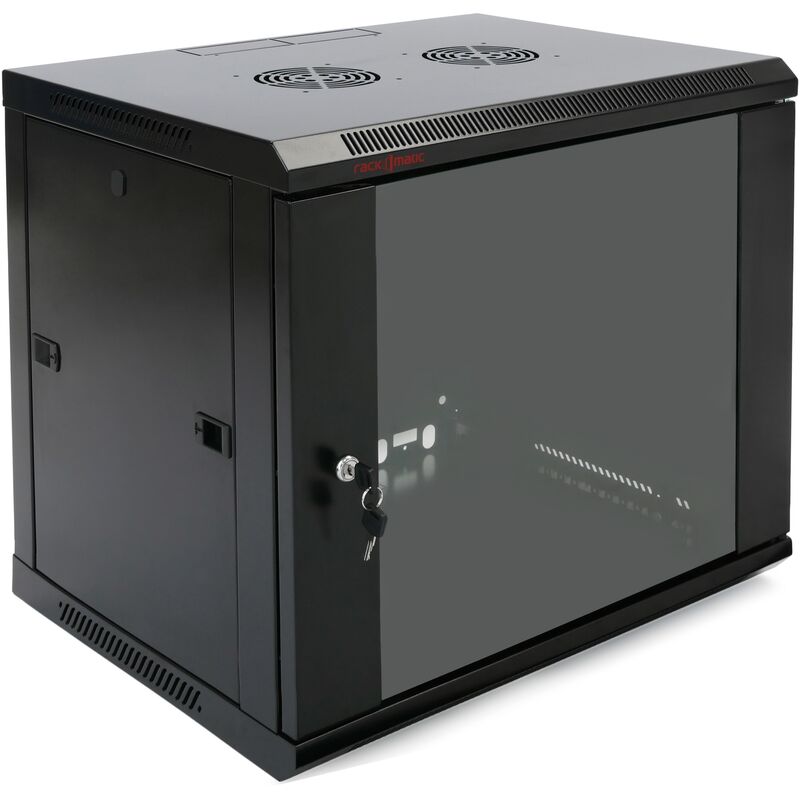 Armadio rack da 19 della gamma RackMatic SOHORack, pensile 9U e dimensioni esterne in mm 600 (A) x 450 (F) x 500 (H). I telai interni sono configurabili in profondità. frontale al fondo dell'armadio (fondo utile) potrebbe raggiungere fino a 365 mm, facendo avanzare il telaio anteriore al massimo. Specifiche Struttura completa e guide per rack anteriori da 19, regolabili in profondità per adattarsi a qualsiasi esigenza, possono essere installate guide posteriori opzionali. # WO043 Porta con vetro di sicurezza che conferisce un design più accattivante e serratura con chiave. Aprendo la porta di 180 gradi. Fori per il passaggio dei cavi, nel pannello superiore e inferiore. Questi fori per il passaggio dei cavi possono essere lasciati aperti o chiusi con una piastra metallica. Foratura per un massimo di due ventole da 12 cm sul pannello superiore (ventole non incluse). Fori nella piastra posteriore per il fissaggio dell'armadio alla parete. Fondo del mobile di 450 mm. Pannelli laterali