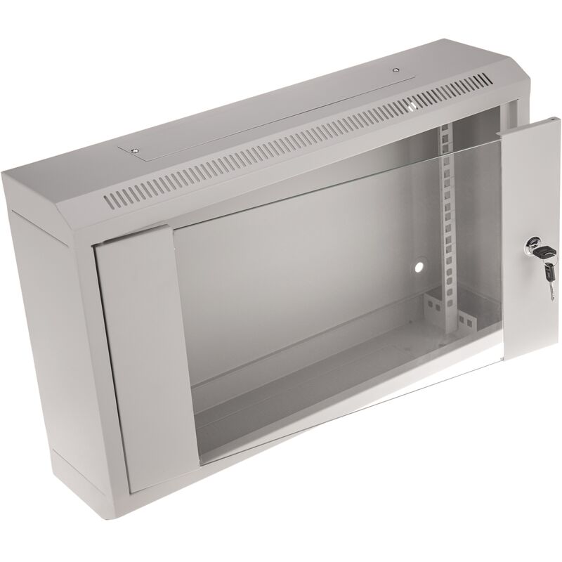 RackMatic SOHORack Mini armadio rack da parete da 19. Armadio da parete 6U e dimensioni esterne in mm di 600 (A) x 150 (F) x 370 (H). Ha un unico telaio frontale compatibile con un rack da 19 e che è configurabile in profondità (6 livelli), anche se di default viene fornito installato al centro del mobile. La distanza dal rack al fondo dell'armadio (profondità utile) può arrivare fino a 105 mm, spostando il rack il più possibile in avanti. Specifiche Struttura completa e con guide a cremagliera frontali da 19, regolabili in profondità per adattarsi a qualsiasi esigenza. Porta a vetri, con serratura e chiave (ne include due). Apertura della porta a 180 gradi. Fori per il passaggio dei cavi, nel pannello superiore ed inferiore. Questi fori per il passaggio dei cavi possono essere lasciati aperti o chiusi con una piastra metallica. Fori nella piastra posteriore per il fissaggio dell'armadio alla parete. Profondità armadio 150 mm. Vengono consegnati al cliente completamente assemblati e