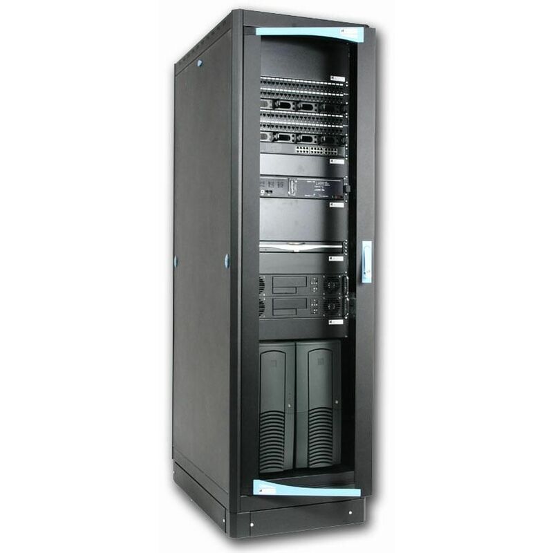 Armadio Server Rack 19'' 600x1000 38 Unità Nero serie Lite Solido armadio rack a pavimento caratterizzato da una struttura robusta con montanti 19” da 2mm di spessore e angolari innovativi da 3 mm di spessore e base rinforzata. Alla robustezza della struttura si unisce il design innovativo e moderno, che non trascura la praticità nell installazione. Infatti, utilizzando una semplice chiave, l'armadio può essere montato e smontato facilmente, permettendo quindi di effettuare un'installazione veloce. Questa rapidità di montaggio è garantita dalle cerniere a sgancio rapido presenti sulla porta anteriore e dalle serrature a chiave presenti sui pannelli. Altre caratteristiche fondamentali come la porta reversibile, i pannelli laterali e posteriori amovibili, lo zoccolo con pannelli asportabili, la doppia coppia di montanti, il fondo che a discrezione più essere mantenuto chiuso o aperto per favorire il ricircolo d'aria, rendono, insieme all ampia gamma di accessori proposti, questi armadi