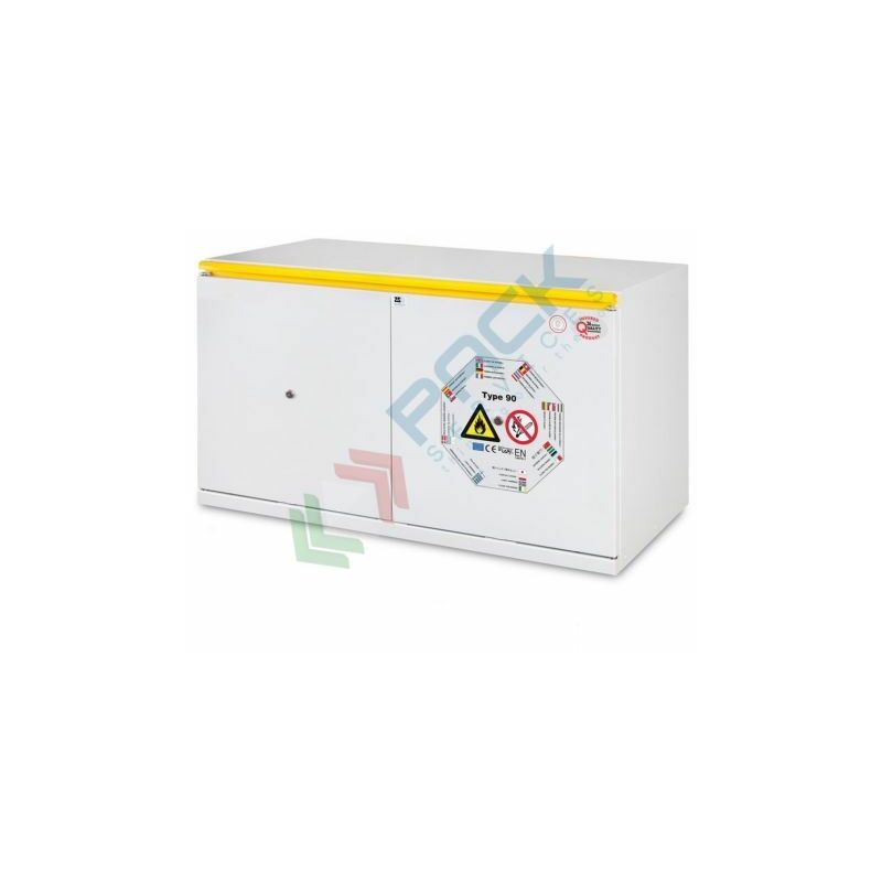 Armadio di sicurezza per lo stoccaggio di prodotti infiammabili con classe di resistenza al fuoco certificata 90 minuti (TYPE 90). Armadio di stoccaggio Mis. esterne 1090 L x 520 P x 620 H mm, Mis. interne 978 L x 349 P x 493 H mm, capacità 30 bottiglie da 1 Lt, peso 134 Kg. Realizzato in lamiera di acciaio elettrozincata con spessori di 1;