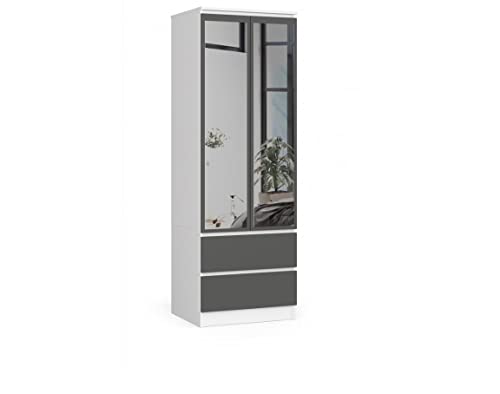 BDW - Armadio con specchio, 2 ante e 2 cassetti per camera da letto, soggiorno e corridoio, 180 x 60 x 51 cm (bianco-grigio)