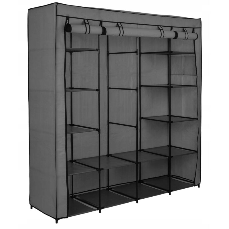 Armadio tessile antracite Olena con ripiani Destinazione d'uso: armadio, | Colori: antracite Gli armadi tessili leggeri sono una soluzione semplice ed economica al problema dello stoccaggio dei vestiti. Gli armadi hanno una struttura in metallo con connettori in plastica, sono semplici e veloci da montare e sono disponibili in tanti colori e fantasie alla moda. Un armadio in tessuto funzionerà bene anche per le persone che cambiano spesso luogo di residenza: può essere assemblato in pochi minuti. Grazie alle cerniere sulla parte anteriore dell'armadio, le singole parti possono essere aperte e chiuse in modo indipendente. Caratteristiche del prodotto 14 ripiani due tasche laterali 2 ganci (aste al centro) chiusure con cerniera materiale permeabile all'aria! struttura in metallo Dimensioni del prodotto Altezza: 170 cm Larghezza: 165 cm Profondità: 45 cm Diametro del tubo 13 mm Carico massimo uniforme: 40 kg Carico massimo per ripiano: 3,5 kg Carico massimo per fascia: 5 kg Informazioni
