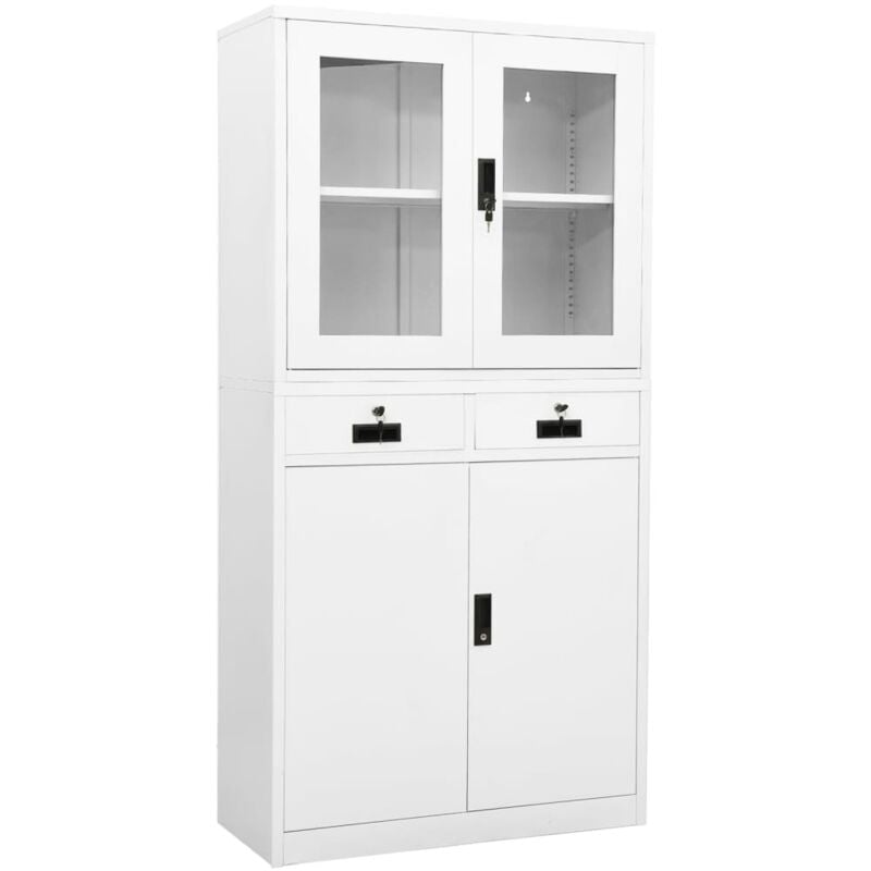 Questo armadio per ufficio, grazie al tipico design a schedario, è ideale per la conservazione dei fascicoli. Questo mobile da ufficio è realizzato in acciaio, che lo rende resistente e facile da pulire. Con 3 ripiani regolabili, questo schedario vi consente di mantenere ordinatamente i vostri file in diverse categorie e di tenerli al sicuro. Le 2 ante nella parte superiore hanno una finestra in vetro temperato, che vi aiuta a trovare facilmente i file che desiderate. I cassetti con guide su cuscinetti a sfera a 3 sezioni garantiscono un'apertura e una chiusura fluide, anche in condizioni di carico elevato. Questo mobiletto si adatta a qualsiasi arredamento d'ufficio grazie al suo design iconico. Colore: Bianco Materiale: Acciaio e vetro temperato Dimensioni: 90 x 40 x 180 cm (L x P x A) Con 3 ripiani regolabili Con serrature 4 ante (Le 2 ante superiori hanno la finestra in vetro temperato) 2 cassetti con guide a sfera a 3 sezioni Peso massimo supportato per ripiano: 30 kg Capacità di
