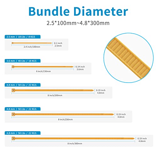 Il pacchetto include: Fascette da 500 pezzi in 5 diverse dimensioni, 100 mm x 2,5 mm, 100 pezzi, 150 mm x 3,6 mm, 100 pezzi, 200 mm x 4,8 mm, 100 pezzi, 250 mm x 4, 8 mm, 100 pezzi, 300 mm x 4,8 mm