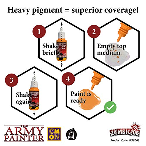 I COLORI PERFETTI PER I TUOI ZOMBIE - The Army Painter ha selezionato per te una gamma di colori perfetta a dipingere i tuoi zombie. Utilizza il colore Prison Jumpsuit per colorare la tuta da carcerato per la saga Prison Outbreak Zombicide o Toxic City Mall. Questi warpaints doneranno ai tuoi modelli un terrificante effetto gore.