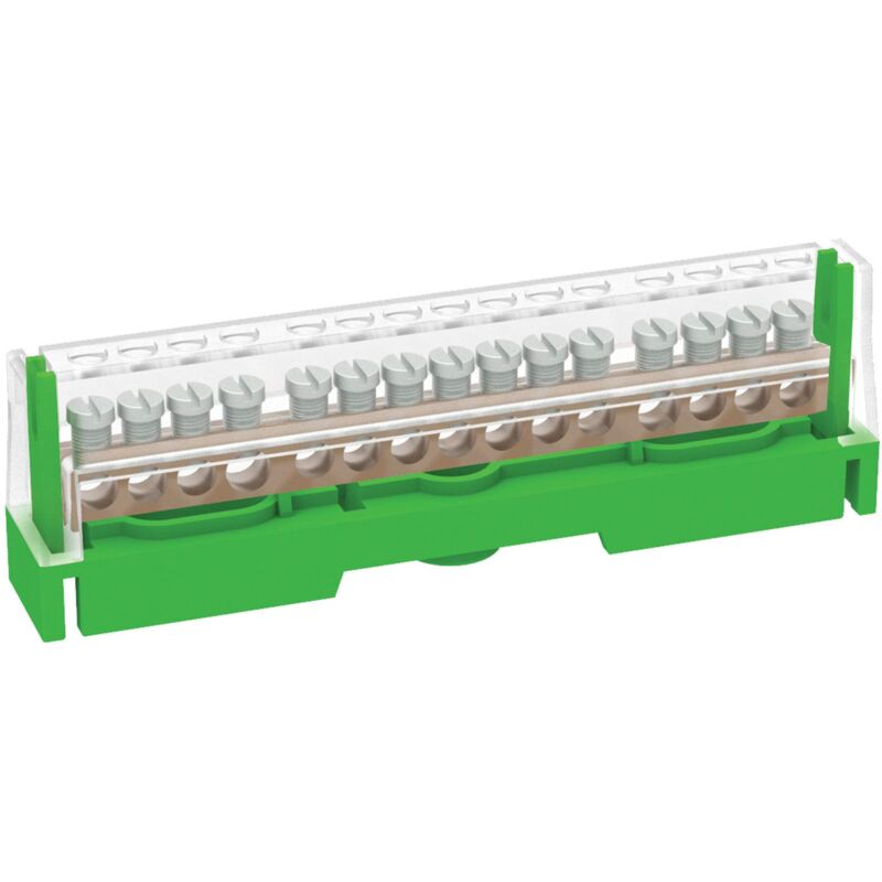 Morsettiera di terra per collegamenti equipotenziali, con coperchio di protezione, barretta in ottone con 15 fori da 6 mm², collegamento cavi 2x16 mm² e 13 x 10 mm², fissaggio a scatto su guida omega 3 o con vite.
