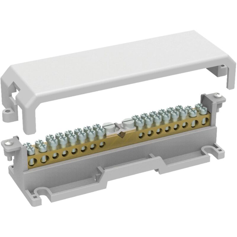 Morsettiera di terra per collegamenti equipotenziali, con coperchio di protezione, barretta in ottone con 17 fori, collegamento cavi 12x6 mm², 4x16 mm², 1 x 50 mm², fissaggio a scatto su guida omega 3 o con vite.