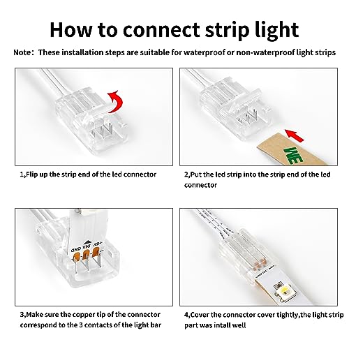 [ Facile da Usare ] Questo Connettori per Strisce LED non è necessaria alcuna saldatura, basta assicurarsi che i terminali positivo e negativo siano orientati correttamente. Collegamento delle estremità dei fili. È sufficiente inserire il cavo di collegamento nell'estremità del filo del connettore e premere. Collegamento dell'estremità della barra luminosa: allineare la parte anteriore delle 3 saldature della barra luminosa con i 3 pin metallici del connettore e chiudere il coperchio.