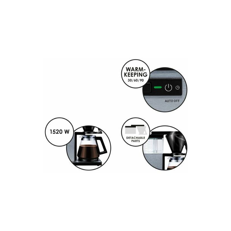 Melitta Aroma Signature deluxe. Installazione: Libera installazione, Tipo di prodotto: Drip coffee maker, Colore del prodotto: Nero, Acciaio inossidabile. Capacità tanica acqua: 1,25 L, Capacità in tazze: 15 tazze, Tipologie di bevande: Caffè. Carico di collegamento: 1530 W. Larghezza imballo: 20,3 cm, Profondità imballo: 37,3 cm, Altezza imballo: 36,5 cm. Certificazione: VDE, GS, CE