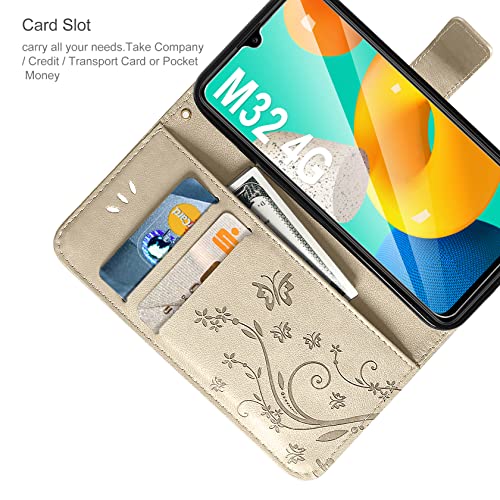 AROYI Cover Compatibile con Samsung Galaxy M32 4G e Vetro Temperato, Retro Design Flip Caso in PU Pelle Premium Portafoglio Slot per Schede Chiusura Magnetica Custodia (Oro)