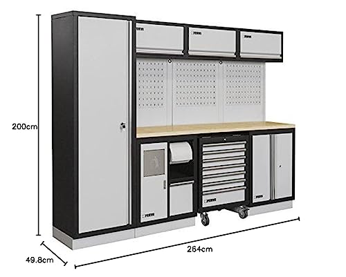 COMPOSTO DA: 3 ARMADI PENSILI CON AMMORTIZZATORI, 1 ARMADIO ALTO CON 3 PIANI INTERNI, 3 PANNELLI FORATI, 3 PROFILI DI GIUNZIONE PER PANNELLI FORATI, 1 PIANI IN LEGNO, 1 CASSETTIERA A CARRELLO CON 7 CASSETTI SU CUSCINETTI, 1 ARMADIO BASSO A DUE ANTE CON UN PIANO INTERNO, 1 ARMADIO BASSO MULTIFUNZIONE, 1 PROFILO PER PANNELLI FORATI.