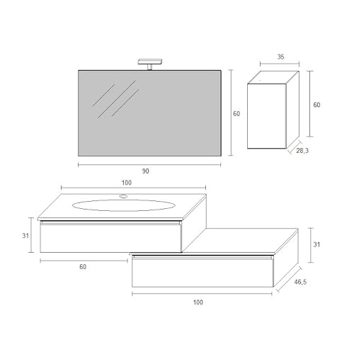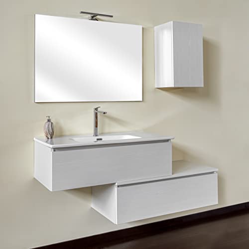 Il mobile da bagno in vendita comprende la base lavabo doppio cassetto da 100cm con chiusura soft e incluso il lavabo in ceramica, il pensile sospeso a un'anta con chiusura soft e lo specchio filo muro per lavabo da 90cm completo di lampada applique a led cromata.