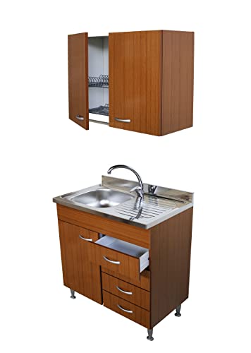 Mobile sottolavello colore teak, 1 anta a sinistra e cassettiera a destra, completo di lavello inox cm.80 e mobile pensile cola piatti cm.80 teak per cucina, 2 ante H.60.