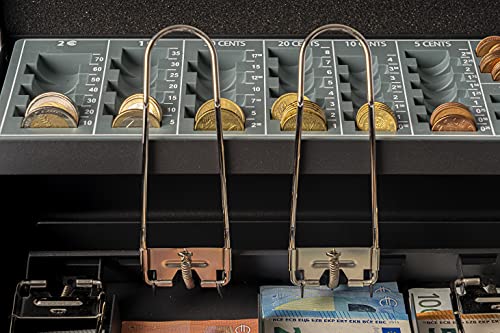 MOLTO PRATICA: il vassoio delle monete resta inclinato quando la cassetta è aperta, in modo da rendere comodamente accessibili sia la parte superiore delle monete che quella inferiore delle banconote.