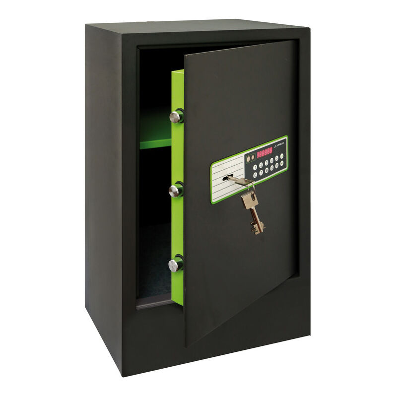 Caratteristiche tecniche: Realizzato in acciaio con frontale di 6 mm di spessore e corpo di 2 mm. Zoccolino alto 10,5 cm con all'interno un cassetto nascosto. Ha un vassoio rimovibile all'interno. Chiusura mediante catenacci in acciaio nichelato: 3 catenacci da 20 mm di diametro. I bulloni sono ANTI-TAGLIO. Sono girevoli, il che impedisce tentativi di taglio con una sega dall'esterno. Con comoda luce interna a LED a basso consumo che si attiva e si disattiva all'apertura e alla chiusura dello sportello. Con ripiano interno nei modelli 240060 e 240080. Il ripiano è asportabile nel caso non venga utilizzato. Sistema di apertura e chiusura: DOPPIA SICUREZZA: serratura elettronica con tastiera più chiave. Una volta inserito il codice corretto, è possibile aprire la cassaforte inserendo e ruotando la chiave. La serratura è da infilare con chiave a doppia mappa. Dispone di 2 possibili codici di apertura: master e utente. Codici da 3 a 6 cifre (1 milione di combinazioni possibili). Viene