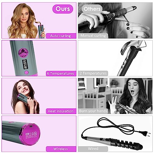 【Ferro arricciacapelli automatico】 Ferro arricciacapelli senza fili, nessuna abilità richiesta, solo un pulsante per creare automaticamente bellissimi ricci o onde sempre e ovunque. Quando l'arricciacapelli arriccia troppi capelli o non funziona correttamente, l'arricciacapelli smetterà di funzionare per evitare che i capelli si aggroviglino e si tirino. Nessun rischio di bruciare o aggrovigliare i fili.