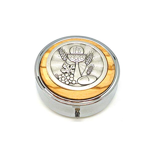 DELL'ARTE Articoli Religiosi Scatola portarosario portapillole Metallo cm 6,2 Finitura nichelata con Inserto Vero Legno di olivo e placca Metallo Calice Prima Comunione